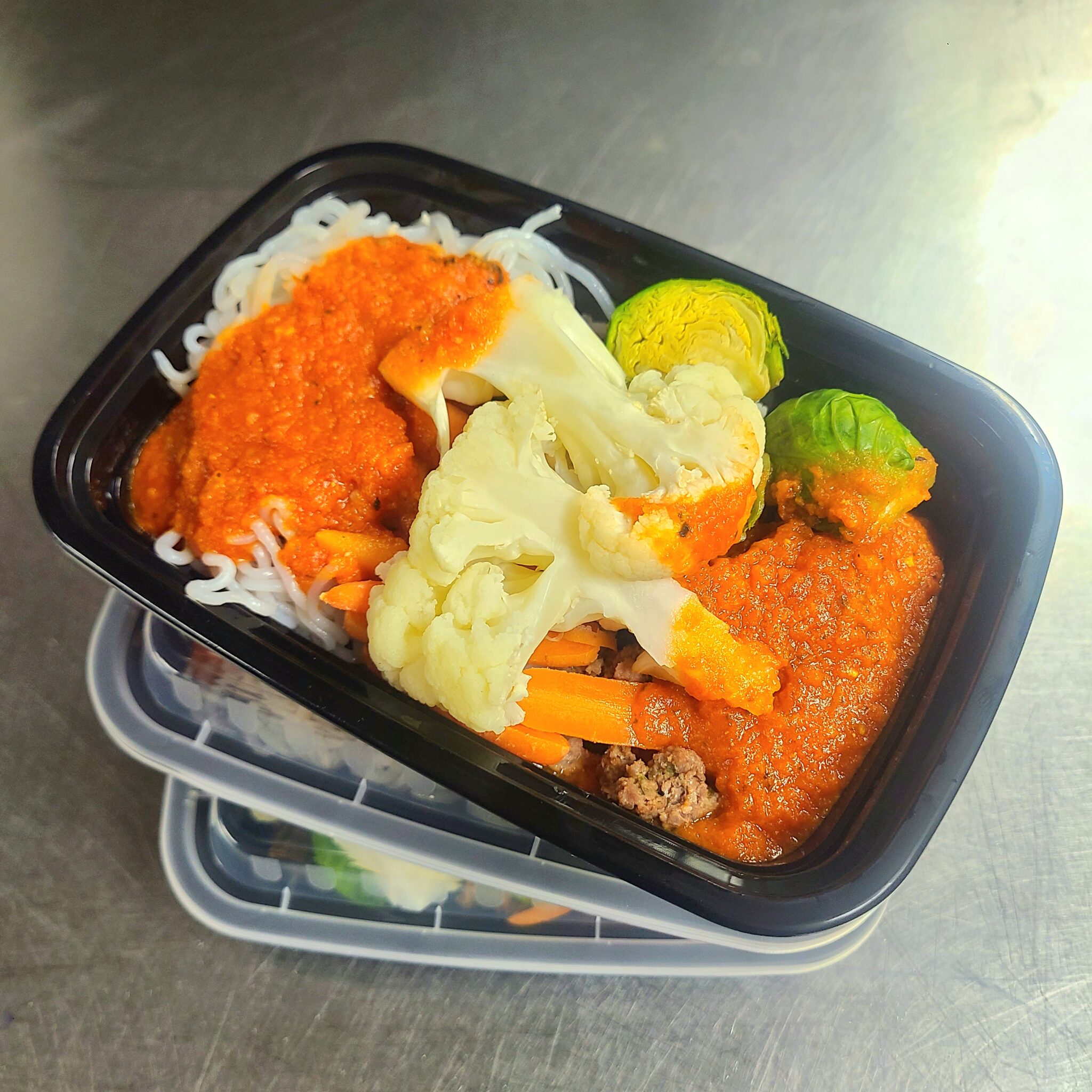 Beef-Bolognese-Paleo-Keto-Meal-Prep-Scottsdale Amazing sweet potato pasta with rich, grass-fed ground beef Bolognese and seasonal veggies