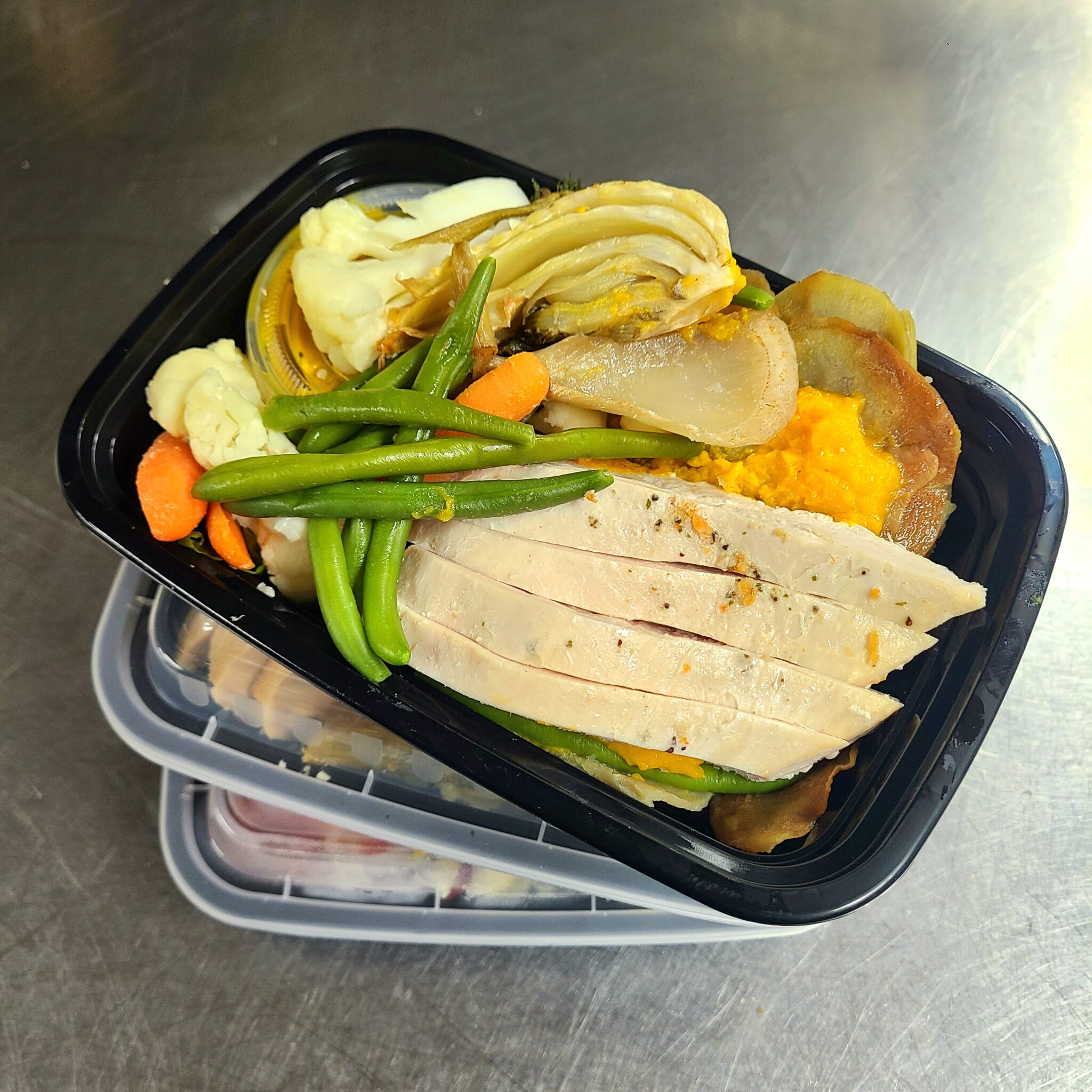 Pasture-raised chicken breast with puree of potato and fennel, cauliflower, green peas, carrot red peppers and turmeric sauce.