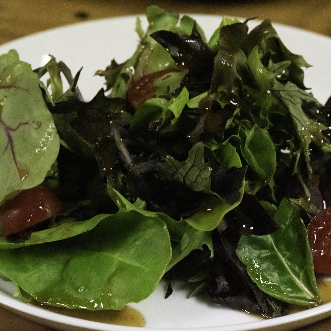 Organic mixed greens with kale, arugula, carrots, cucumbers and tomatoes with Sapiens cider vinaigrette.