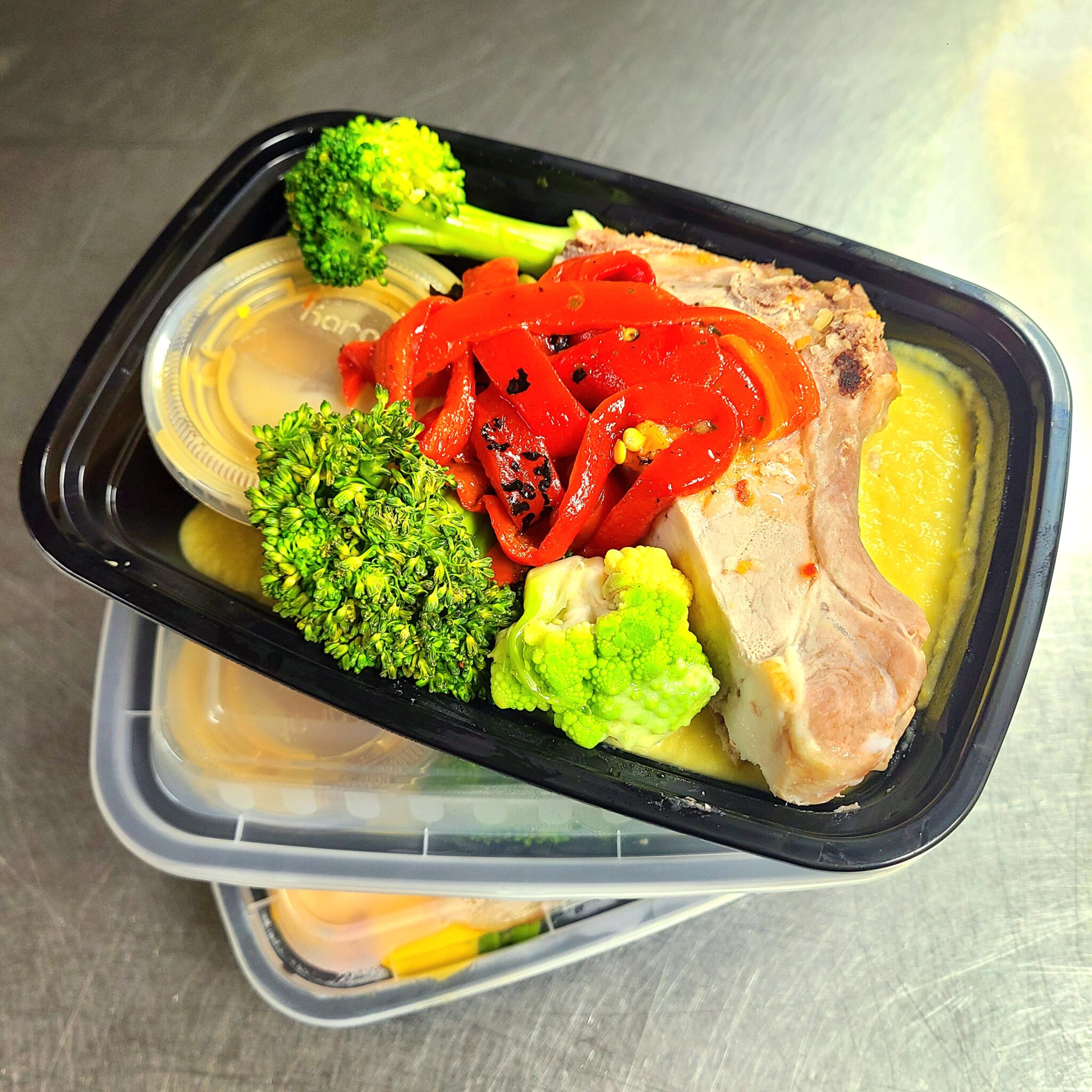 Natural pork chop with zucchini puree, broccoli, cauliflower, roasted bell peppers and sherry crème sauce