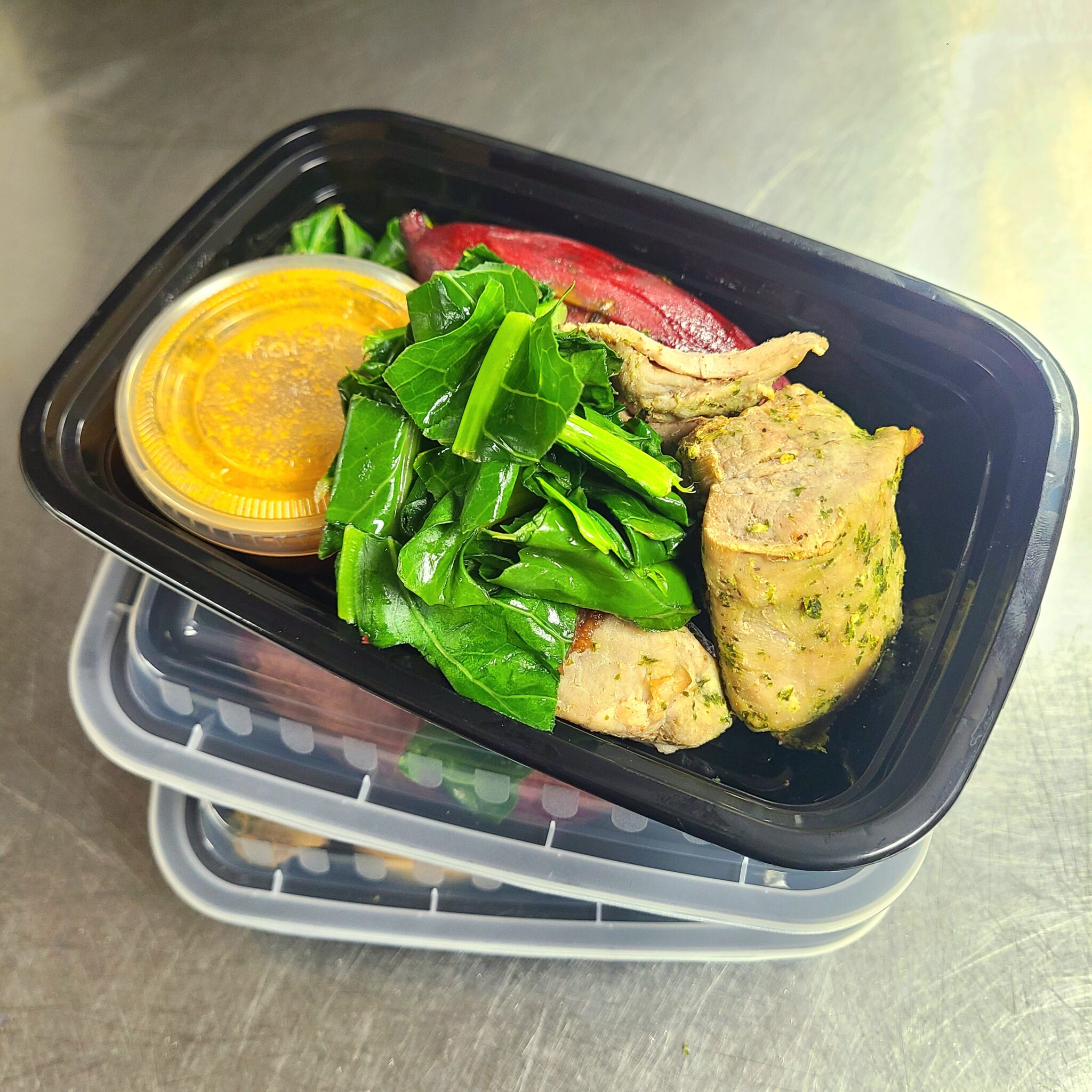 Natural pork tenderloin with baked sweet potato, sauteed collard greens and shallot chutney