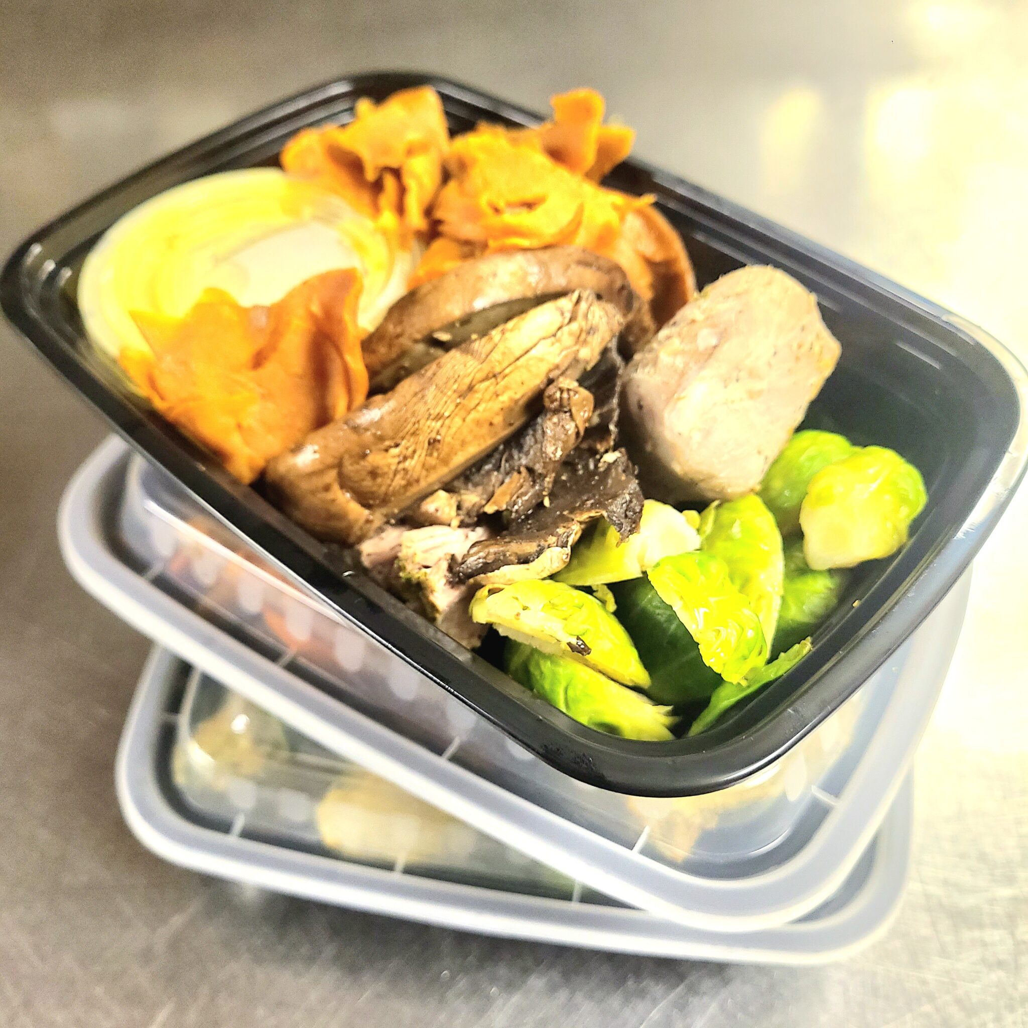 Natural pork tenderloin with sweet potato hash, brussels sprouts, mushrooms and Paleo crème of spinach