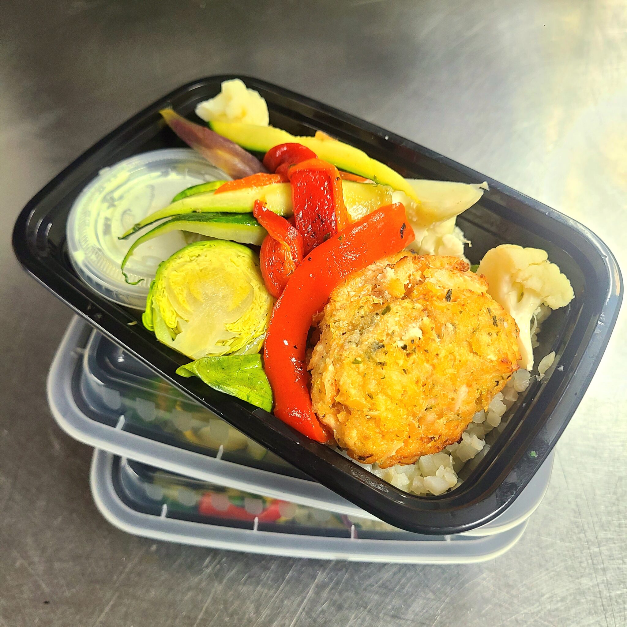 Alaskan salmon cake with riced cauliflower, julienne carrots, zucchini, yellow squash and red bell pepper with avocado/basil sauce.