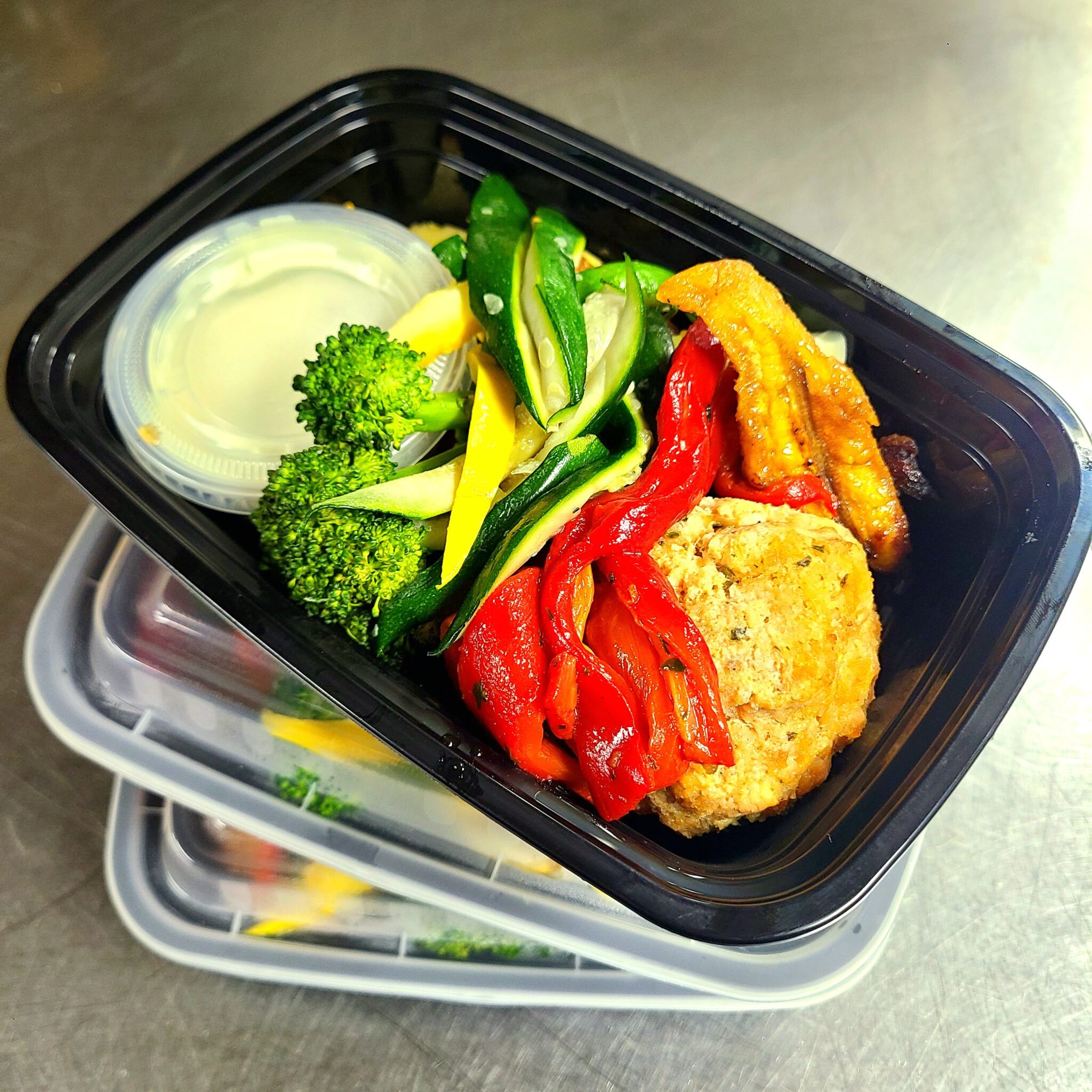 Alaskan salmon croquette with plantains, julienned carrots, zucchini, yellow squash and red bell pepper with Fresno pepper aioli