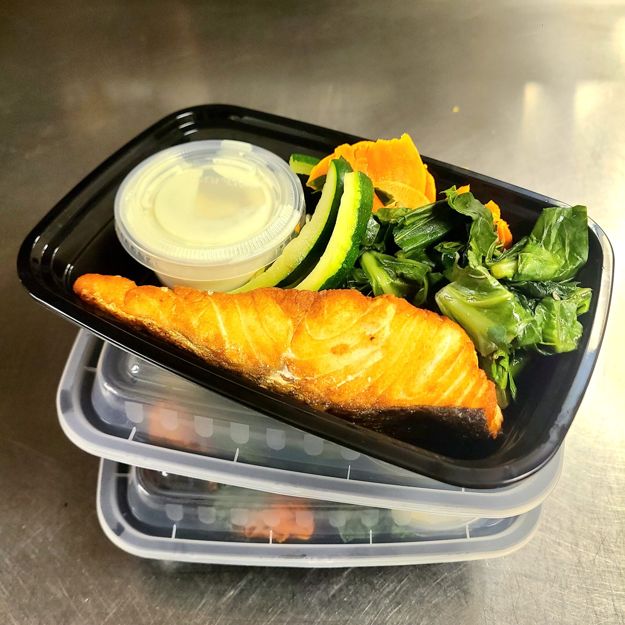 Alaskan salmon with sweet potato hash, pumpkin seed, zucchini, dates, Swiss chard and lemon sauce
