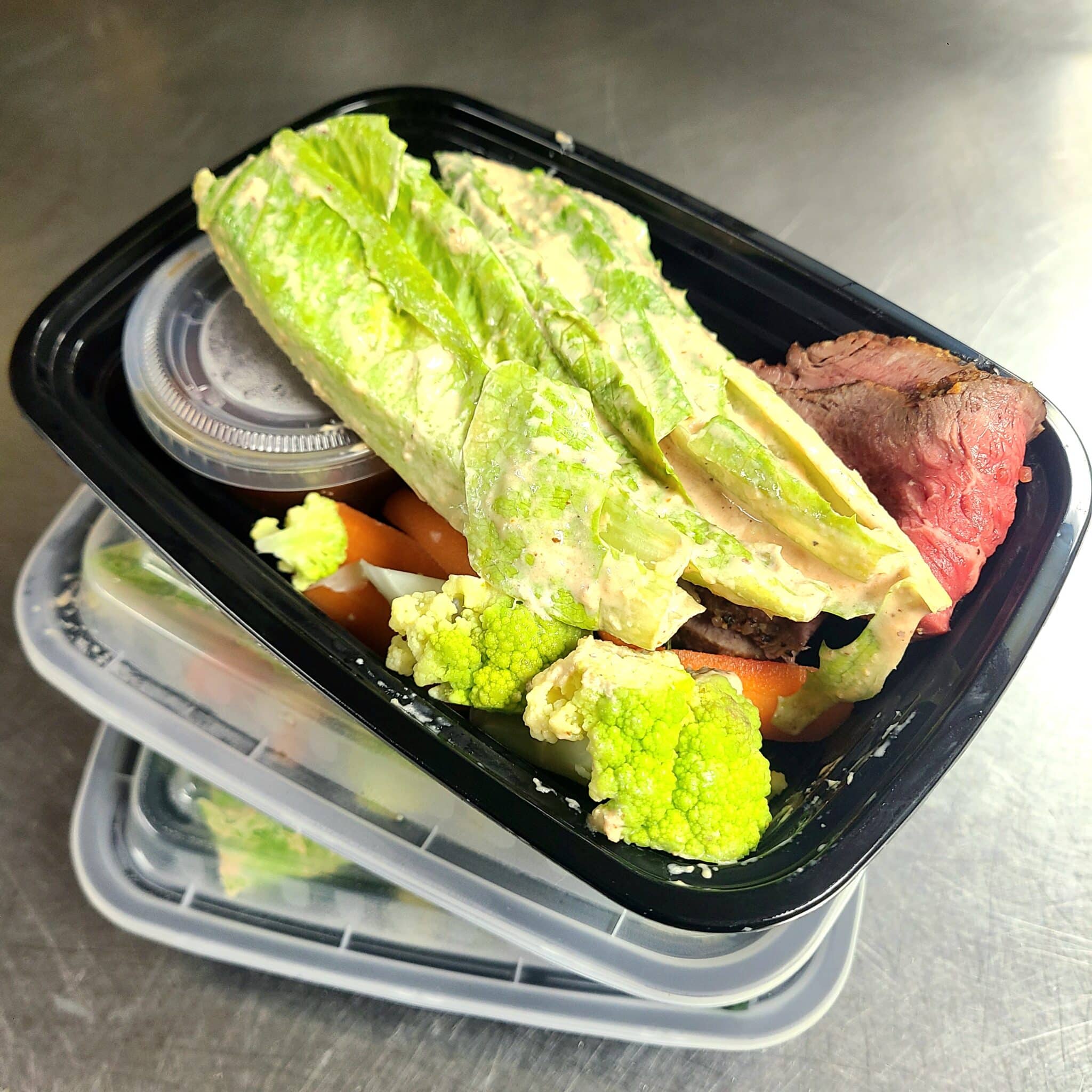 Grass-fed steak with charred romaine lettuce, vegetables and home-made horseradish Caesar sauce